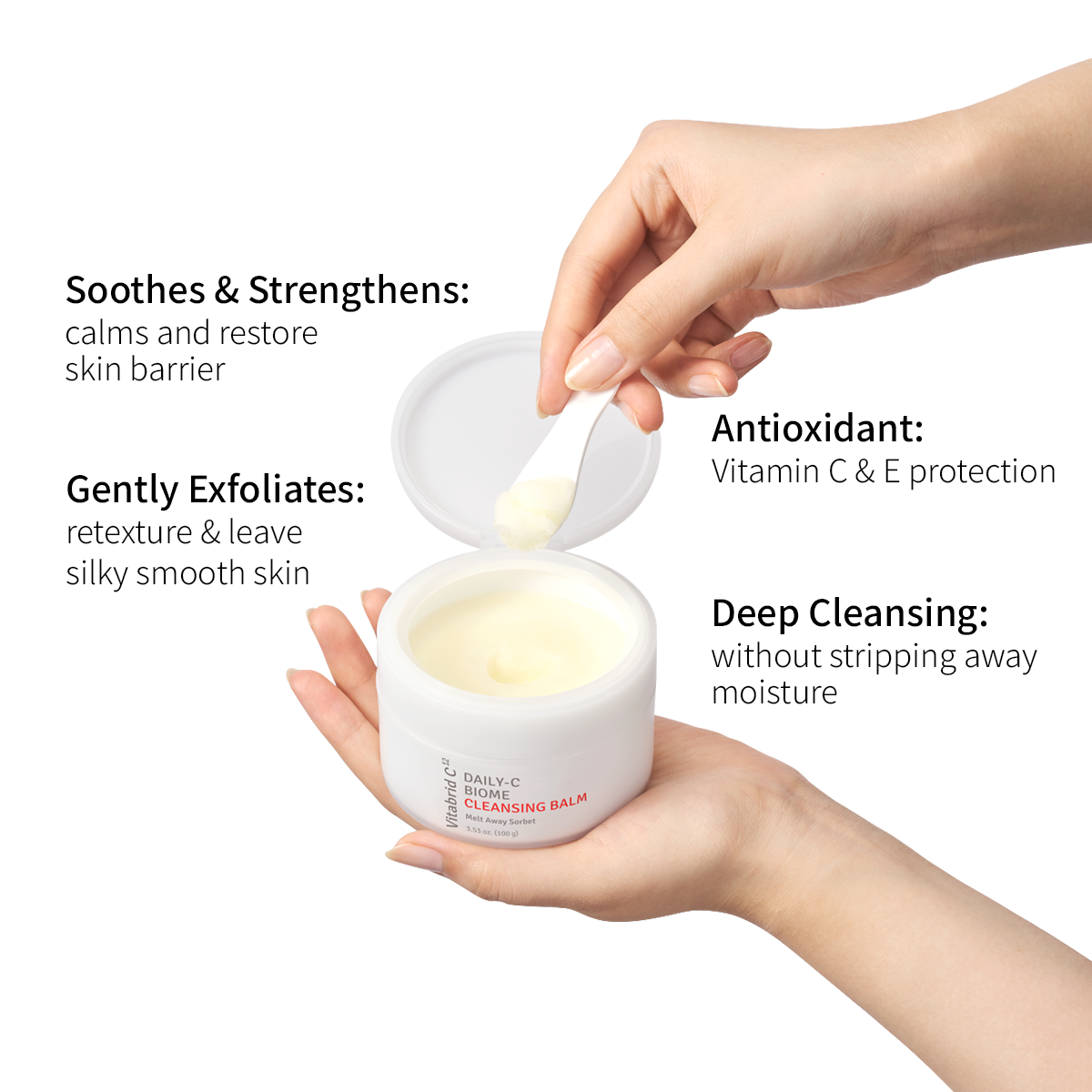 What it is: A nourishing cleansing balm enriched with Vitabrid CG and Biome ingredients that transforms from balm to oil to milk. It effectively removes stubborn makeup, sunscreen, and impurities while helping to soothe and protect the skin barrier.